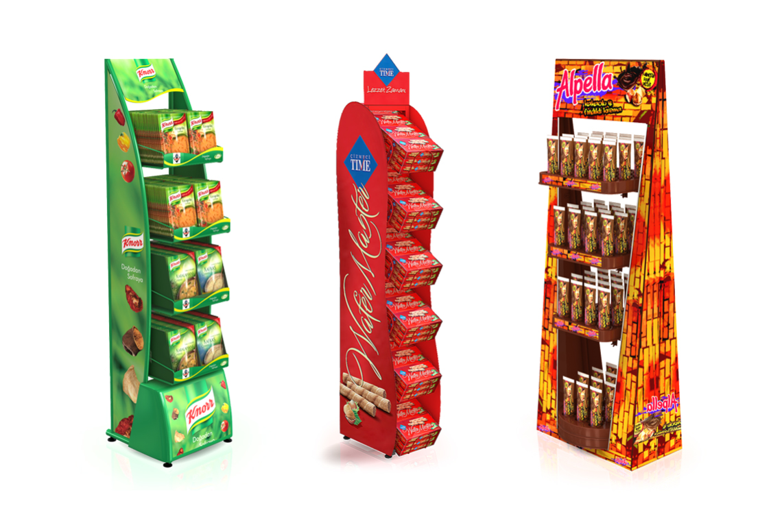 Ayaklı standlar raflı yapıları sayesinde ürün çeşitlerinizi rahatlıkla sınıflandırıp sergileyebileceğiniz standlardır. Yan duvarlar, alınlık, raf önleri ve baza alanları görsel iletişim için kullanabileceğiniz geniş alanlardır. İhtiyacınız doğrultusunda hazırlanan tasarımlar sayesinde ağır yük taşıma kapasitesine sahiplerdir.. Özel tasarım plastik ayaklı standlar ihtiyacınıza ve isteklerinize yönelik en dikkat çekici ve faydalı yer standı türüdür.